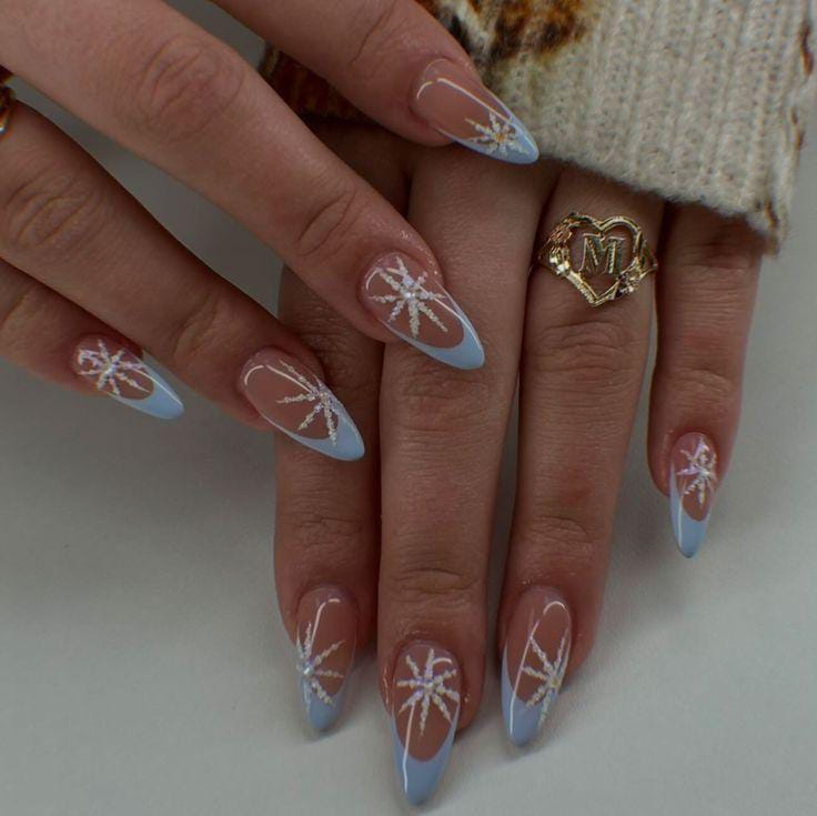 Soft baby-blue tips paired with delicate white snowflakes create a crisp, airy winter December vibe that feels light, clean, and subtly festive.