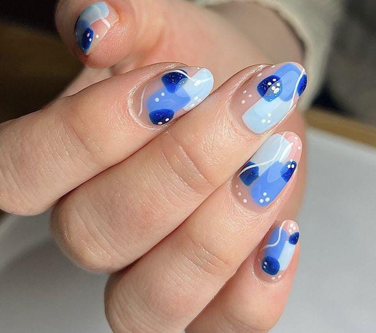 Layered blue abstract shapes and tiny white dots over a sheer base give these nails a cool, icy, modern feel perfect for December.