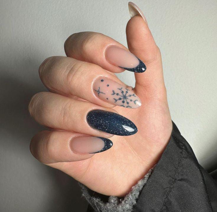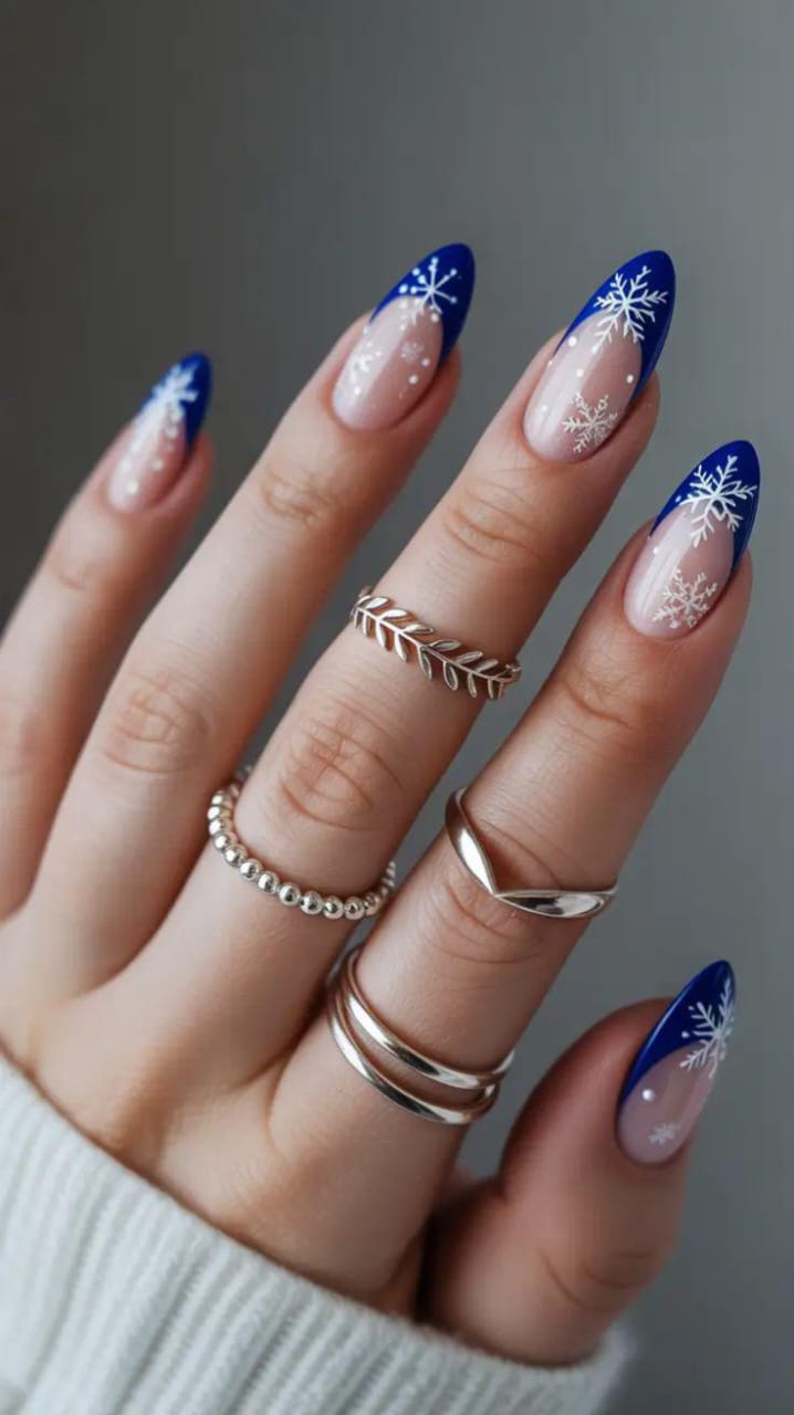 Deep blue French-style tips paired with nude bases and fine white snowflakes create a chic, wintry contrast that feels elegant and modern December celebration.