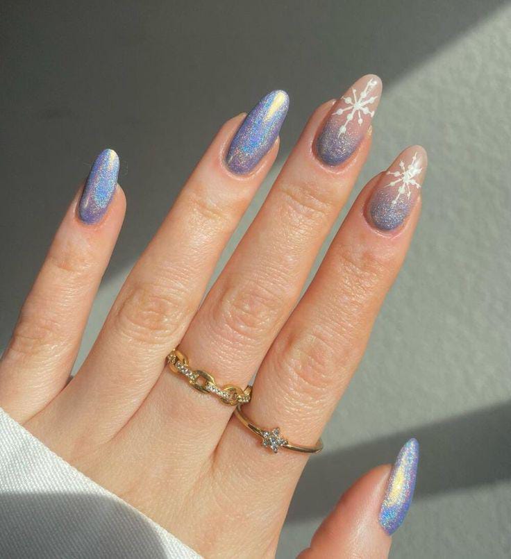 These nails shine with a holographic lavender sheen, paired with crisp white snowflakes for a frosty, icy December look. The finish is bright, reflective, and perfect for winter light.