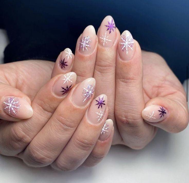 A sheer nude base is decorated with scattered white and purple snowflake bursts, creating a soft, playful winter pattern. The look is simple, airy, and full of holiday and December charm.