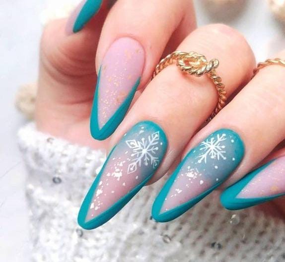 A striking teal outline frames soft pink and blue gradients, highlighted with bold white snowflakes and tiny gold flecks. The combination feels icy, modern, and full of wintery December energy.