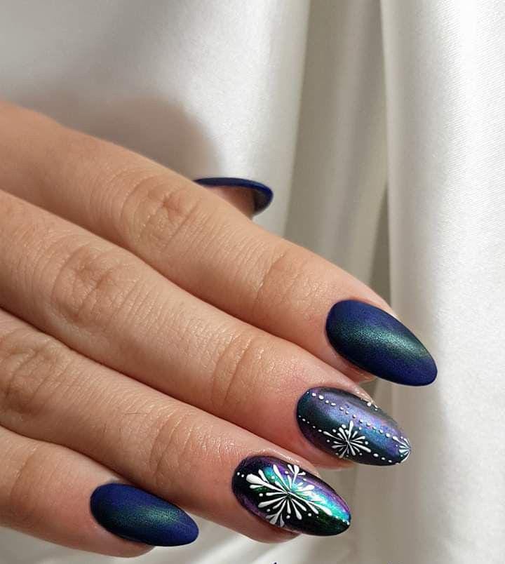 This design blends deep navy shimmer with soft nude tones, finished with delicate snowflake accents that give it a cozy winter- December night feel. The mix of sparkle and minimal detailing makes it both elegant and festive.