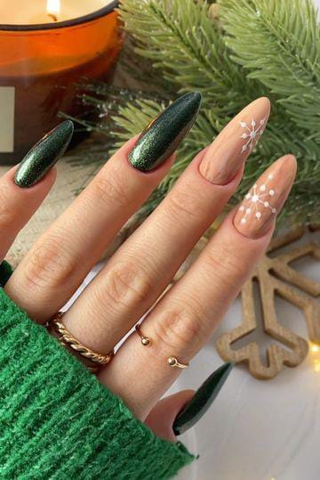 Rich forest-green shimmer nails are paired with nude almond tips featuring simple white snowflakes, creating an elegant balance of bold and soft December holiday tones.