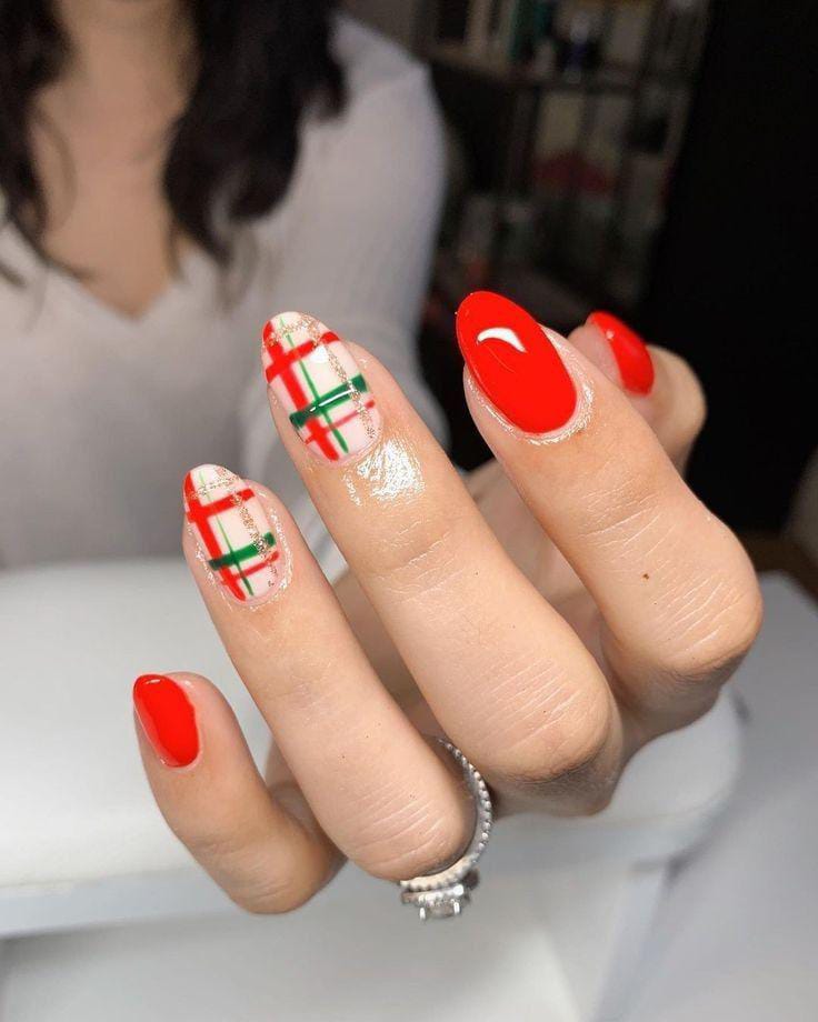 Bright red nails mix with clear plaid accents in green and red stripes, giving a fun, festive, Christmas and December themed look.