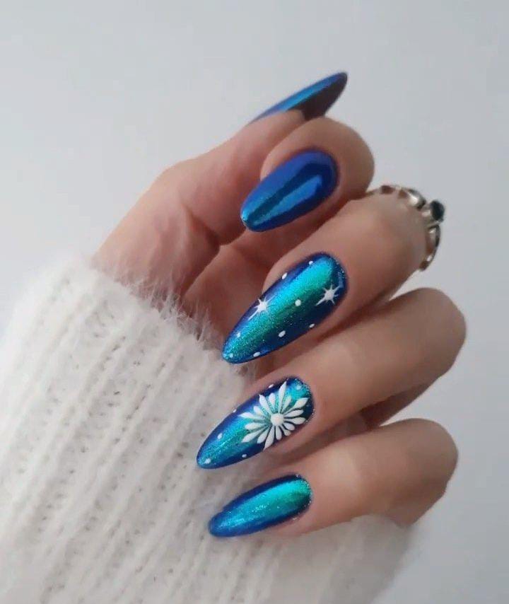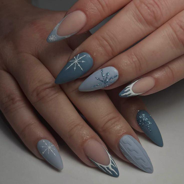 Matte blue nails decorated with glittery and painted snowflakes, alongside white “melting” tips and a knit-patterned accent, create a calm, frosted aesthetic perfect for cold-weather December style.