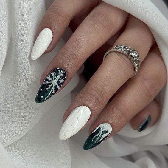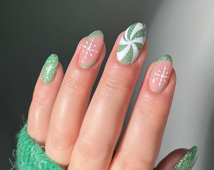 A blend of sparkly green accents, soft nude bases, and crisp white snowflakes creates a fresh, peppermint-inspired December look. The swirled candy design adds a playful holiday twist.