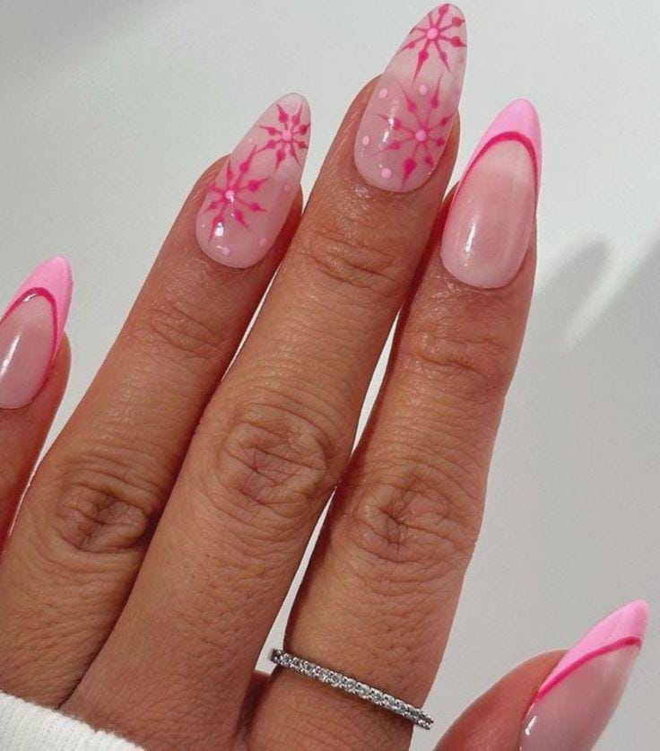 Soft pink almond nails are paired with bright pink snowflakes and modern French tips, giving a cheerful, feminine holiday feel. It’s festive but still light and delicate December.