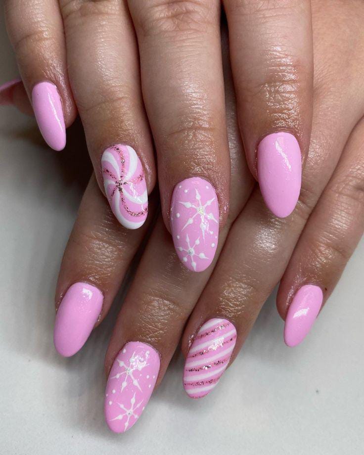 This set combines bright pink polish with peppermint swirls, soft snowflakes, and glitter-striped accents for a cute, candy-themed December look. The overall vibe is fun, sweet, and very festive.
