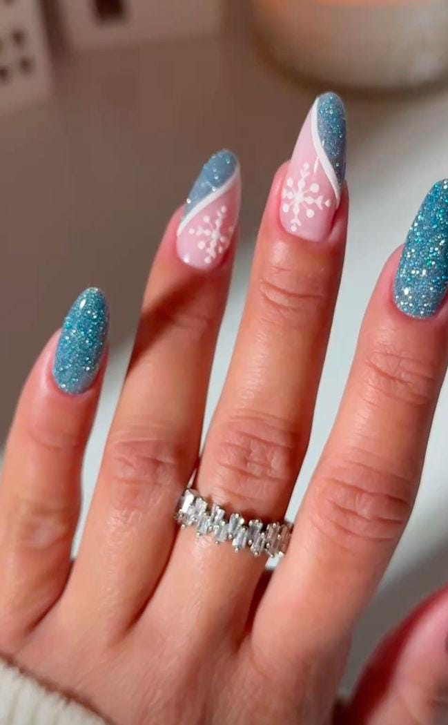 Cool blue glitter nails blend with pink bases and crisp white snowflake art, creating a fresh wintery December mix that feels both frosty and feminine.