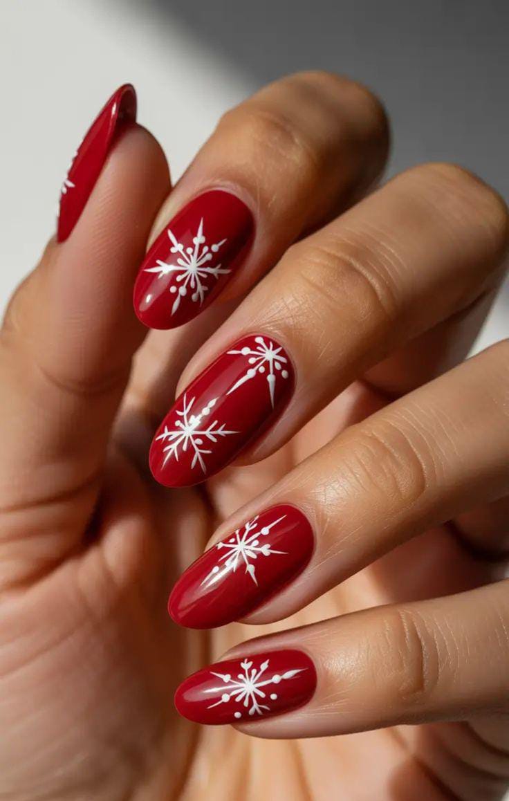 Bold red almond nails with clean white snowflake designs give a timeless Christmas feel — simple, polished, and effortlessly December holiday festive.