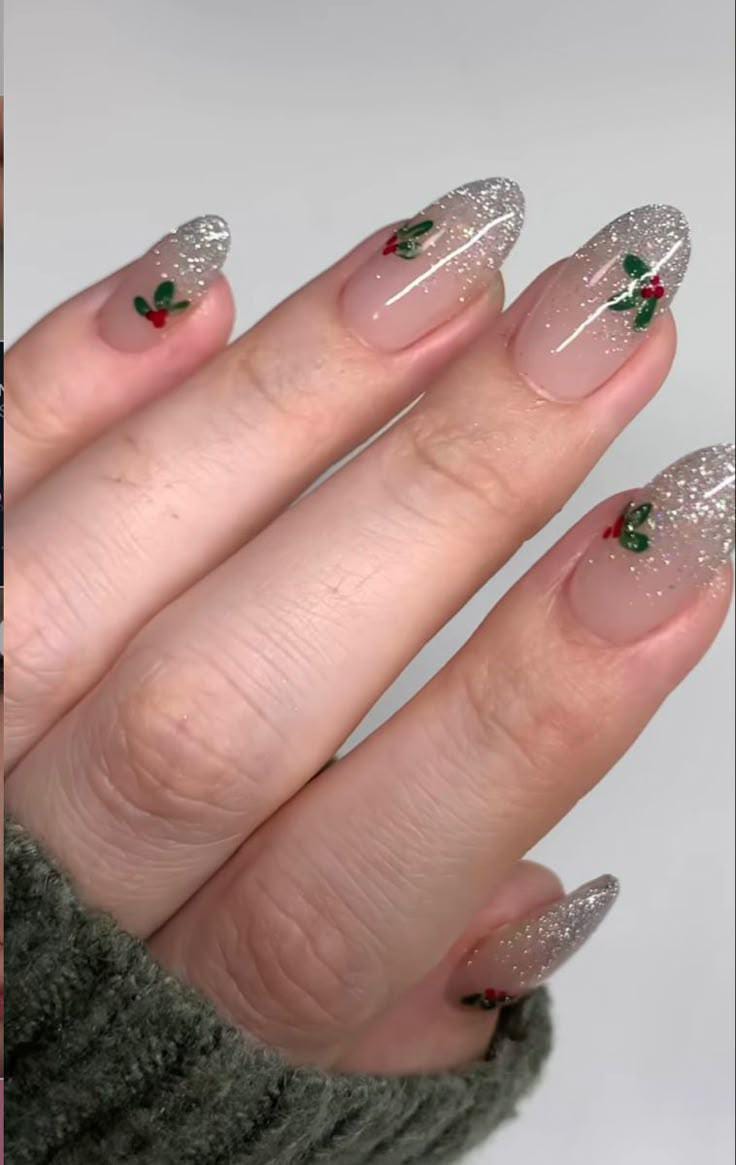 These nude almond nails are topped with a dusting of silver glitter and tiny holly accents, creating a soft, festive look that feels perfect for December. The overall style is delicate and wintery without being too bold.