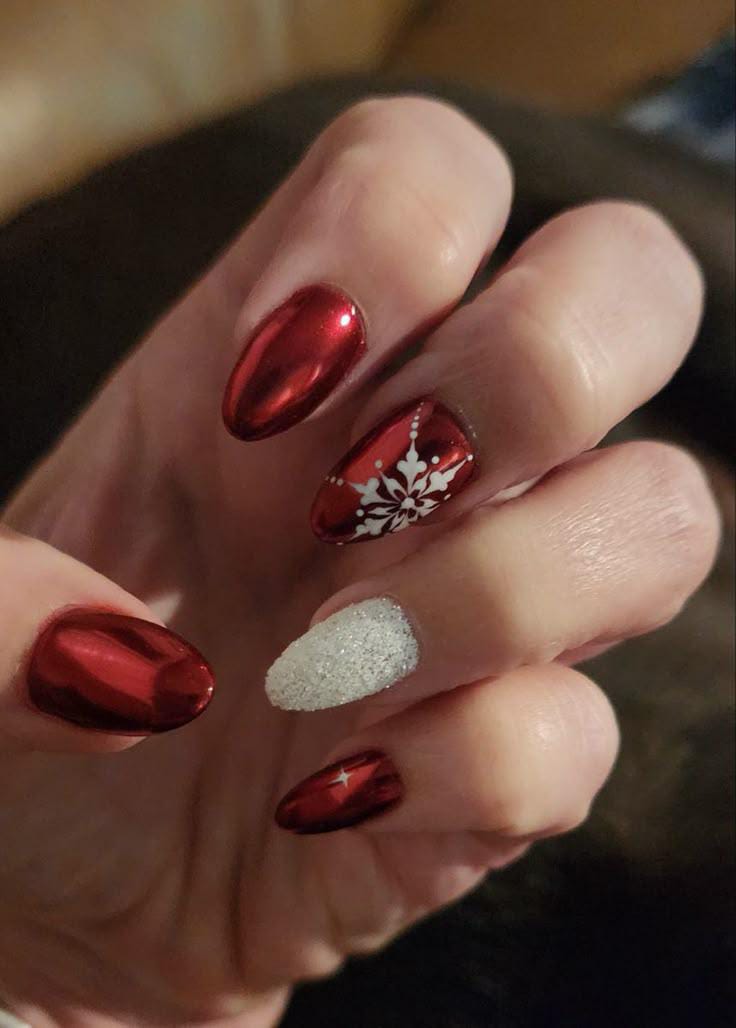 Rich red chrome nails pair with a textured white accent and a bold snowflake design, giving the set a dramatic holiday shine. It’s a striking mix of glossy metallic warmth and crisp winter December detailing.