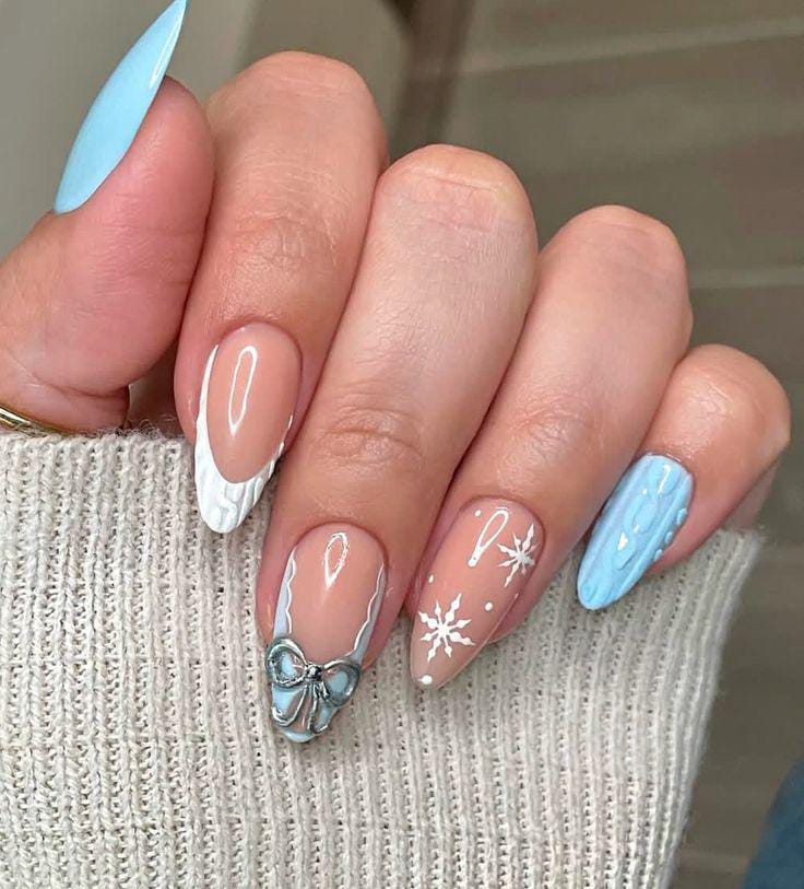 Cool blue tones, sweater-knit textures, and white snowflake accents give these nails a cozy yet polished winter December vibe. The mix of patterns keeps the design fun while still looking clean and seasonal.