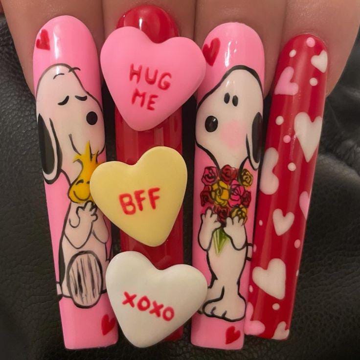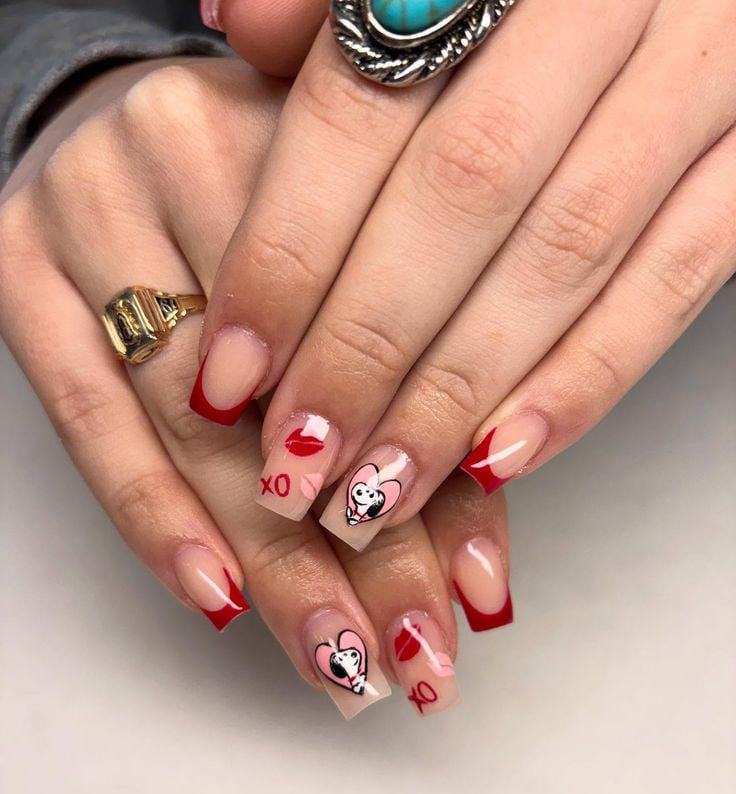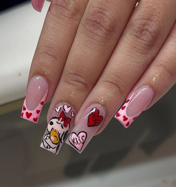 Light pink nails feature heart French tips and adorable Snoopy-inspired Disney Valentine art. The design feels cute and nostalgic with a soft, romantic color palette.