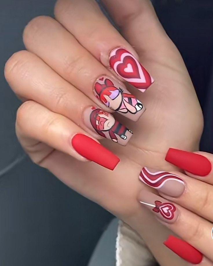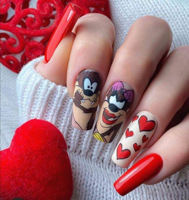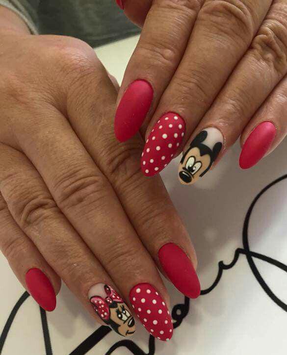 Deep red- nails are paired with white polka dots and a sweet character accent for a classic Disney Valentine feel. The look is bold, flirty, and timeless.