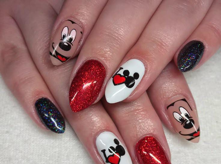 This set combines glittery red and black nails with Mickey-inspired heart art. The look is bold, festive, and perfect for a glam Disney Valentine style.
