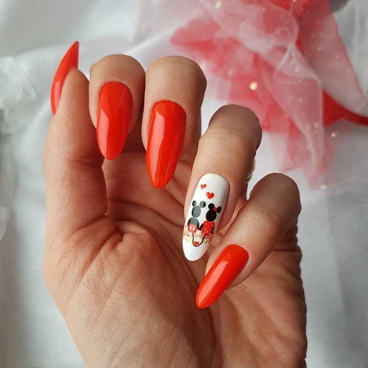 Deep red nails with white accents and a Disney character detail give a timeless Valentine feel. The design looks warm, charming, and slightly nostalgic.