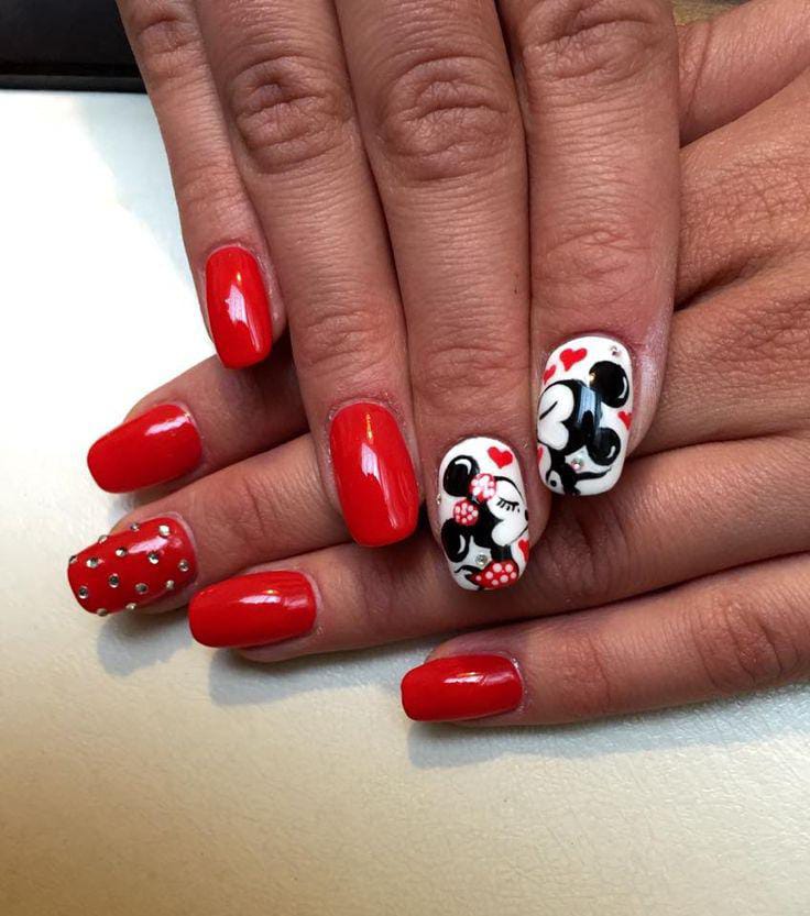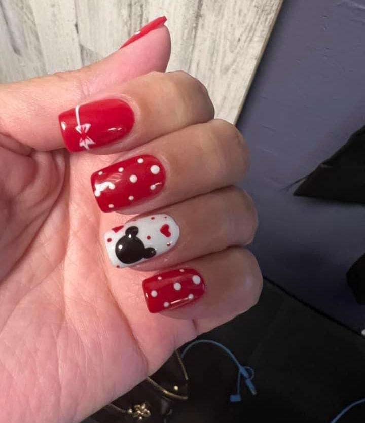 Bold red nails with white polka dots create a timeless Minnie Mouse style. The cartoon accent adds a fun, nostalgic Disney Valentine touch.