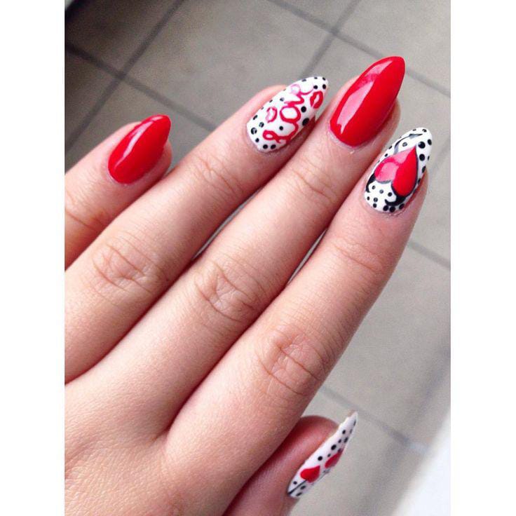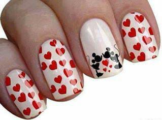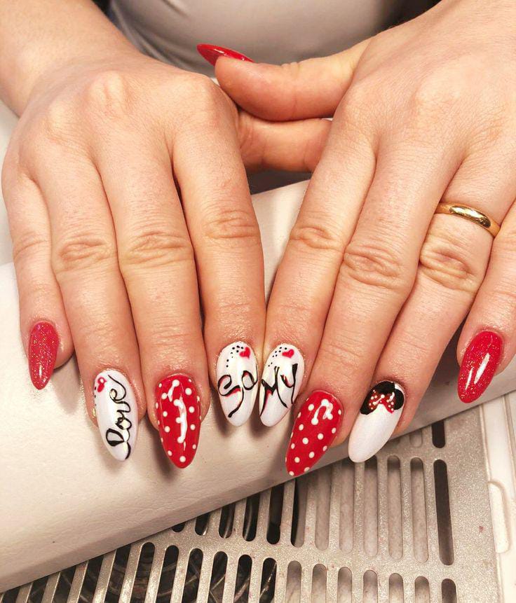 Red, white, and polka-dot nails mix with handwritten love details and Minnie elements. It feels fun, flirty, and perfect for a Valentine’s date look.