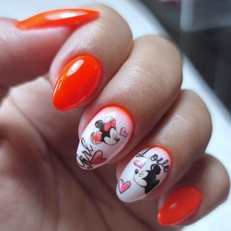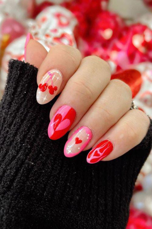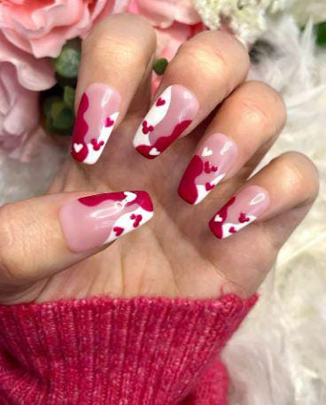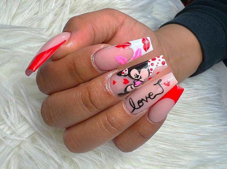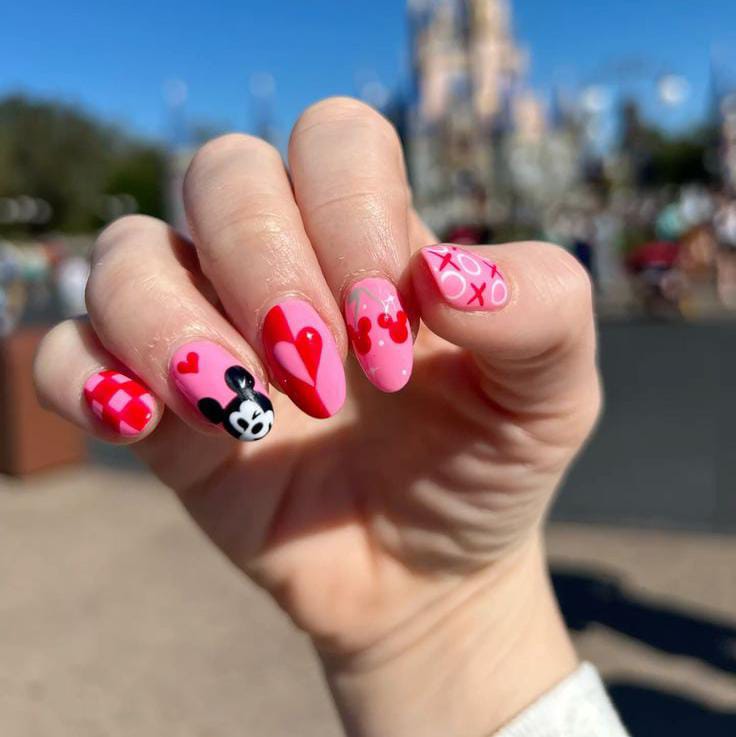 A playful mix of pink, red, and white nails with cute Mickey and Minnie accents. The design feels fun, bold, and perfect for a Disney-themed Valentine’s look.