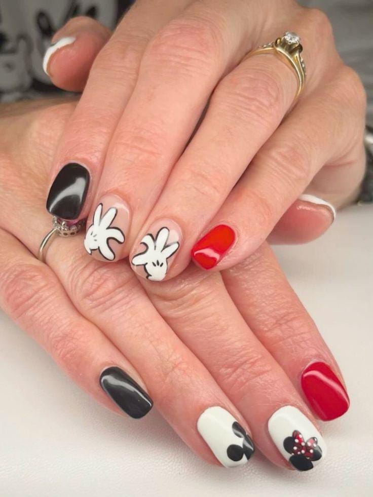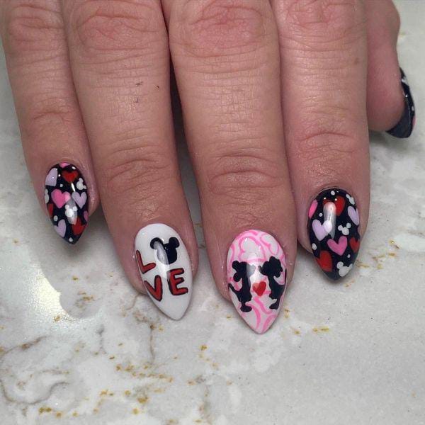 Black, red, and white nails come together with simple Mickey gloves and heart accents. The style is clean, modern, and subtly Disney-inspired Valentine’s look.