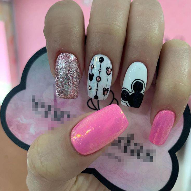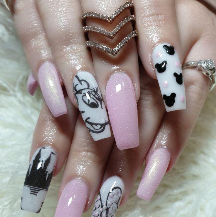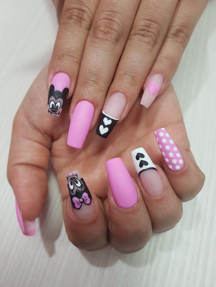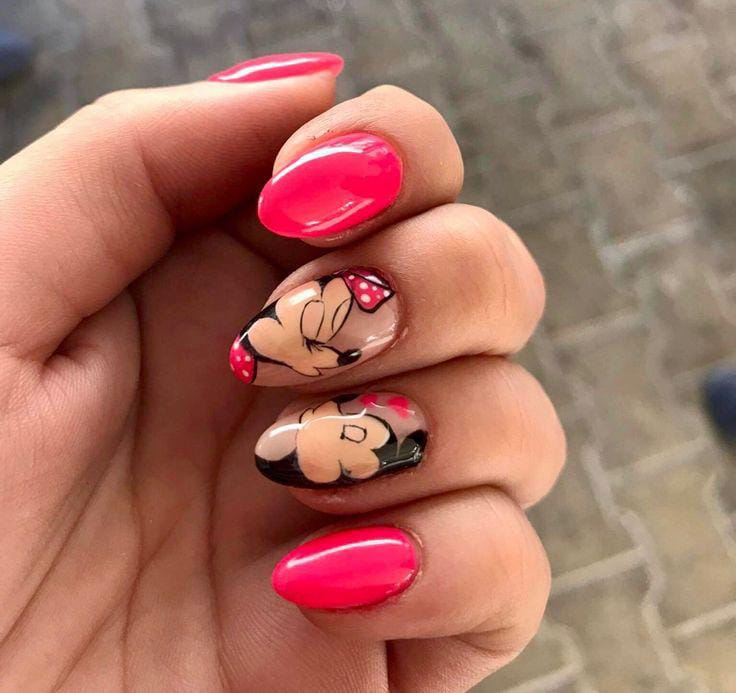 Bright pink glossy nails paired with soft nude bases and Minnie-inspired art. The overall Disney vibe is sweet, romantic, and very eye-catching Valentines.