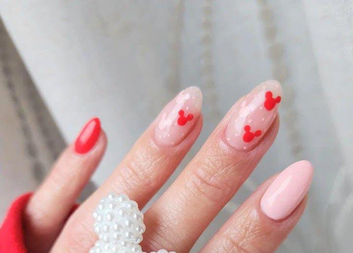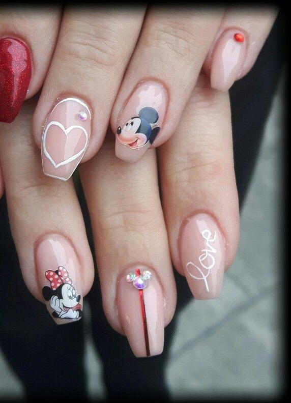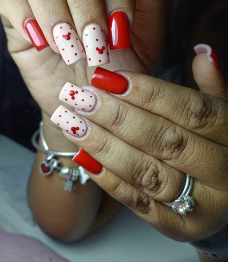 This design mixes glossy red nails with soft nude accents covered in tiny red dots and playful mickey-shaped silhouettes. The overall look is sweet, romantic, and perfect for a subtle Disney Valentine theme.