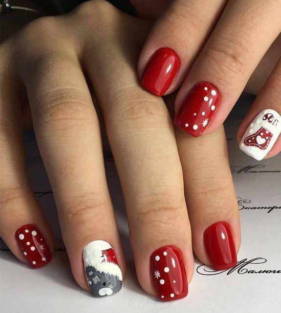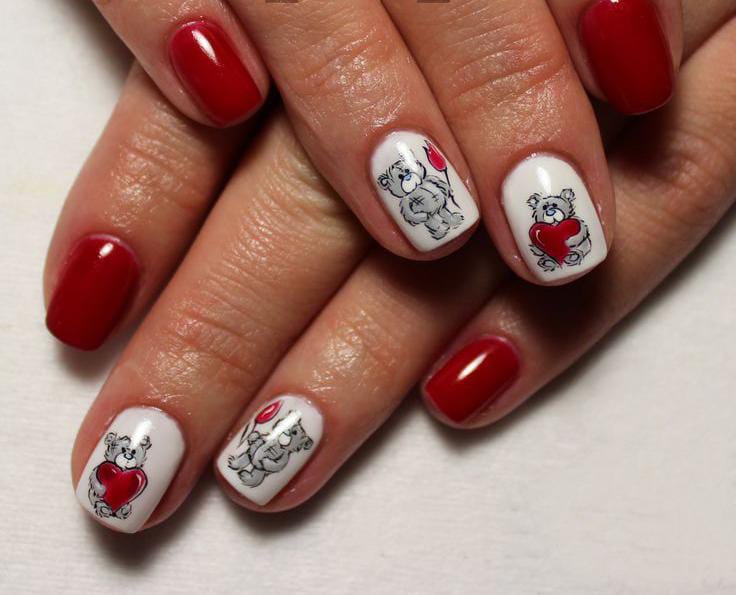 Classic red and white nails feature cute teddy bear illustrations holding hearts. The look feels cozy, sweet, and very Valentine-ready.