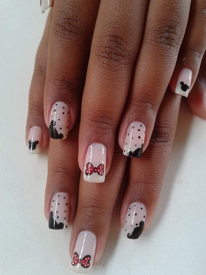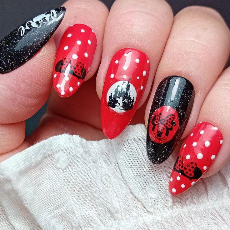 Bold red and black nails with white polka dots create a playful, vintage Disney feel. Minnie-inspired bows and castle accents give it a romantic yet iconic Valentine’s look.