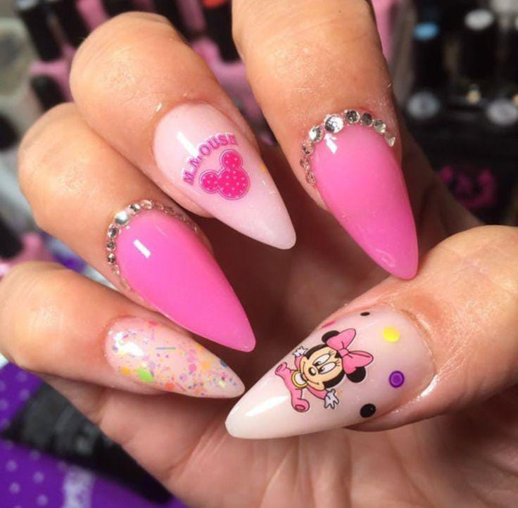 Bright pink stiletto nails feature Minnie details, glitter accents, and heart elements. The style is bold, glamorous, and very festive for Valentine’s Day.