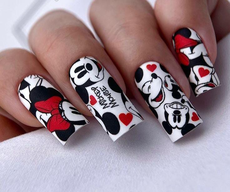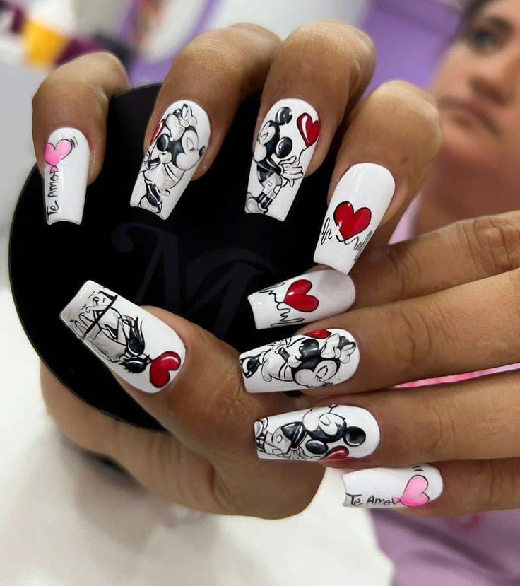 Bold black, white, and red nails feature cartoon-style faces, hearts, and graphic patterns across long square nails. It feels fun, nostalgic, and very expressive with a strong Disney Valentine flair.