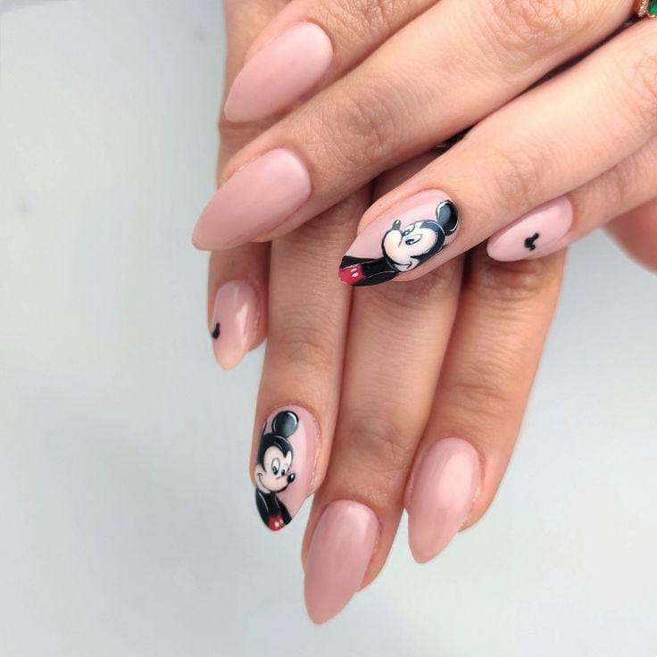 Nude pink nails with simple Mickey designs as accent nails. This set feels clean, classy, and perfect for a subtle Disney Valentine style.
