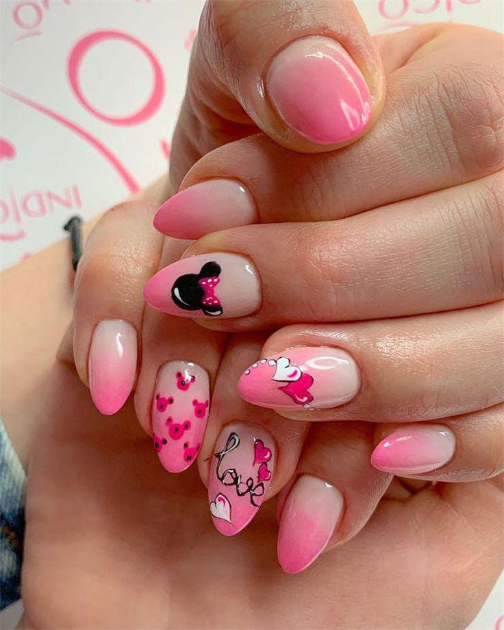 Pink ombré nails with cute Minnie-inspired art bring a fun and flirty Valentine’s theme. Hearts and playful details keep the design youthful and full of Disney charm.