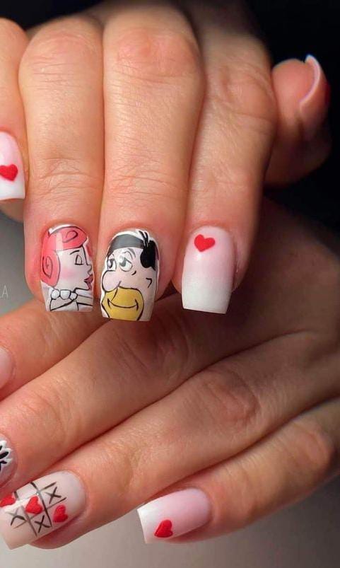 White and nude nails feature a romantic cartoon couple with simple red heart accents. The design feels sentimental and timeless, celebrating Disney-style love Valentines.