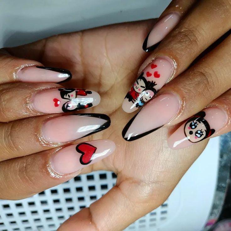 Clean white nails showcase black sketch-style character art with red heart accents for contrast. This design feels artistic, romantic, and slightly Disney dramatic Valentines.