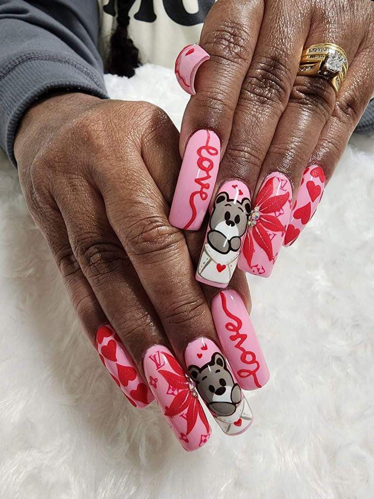 Pink and red nails showcase teddy bear art, heart patterns, and “love” lettering for a bold Valentine statement. The overall vibe is playful, cozy, and extra cute with a Disney-inspired twist.