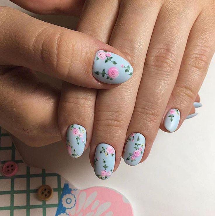 A baby blue base is paired with tiny pink rose patterns and fine green vines across each nail. The overall look is sweet, romantic, and perfect for early spring aesthetics.