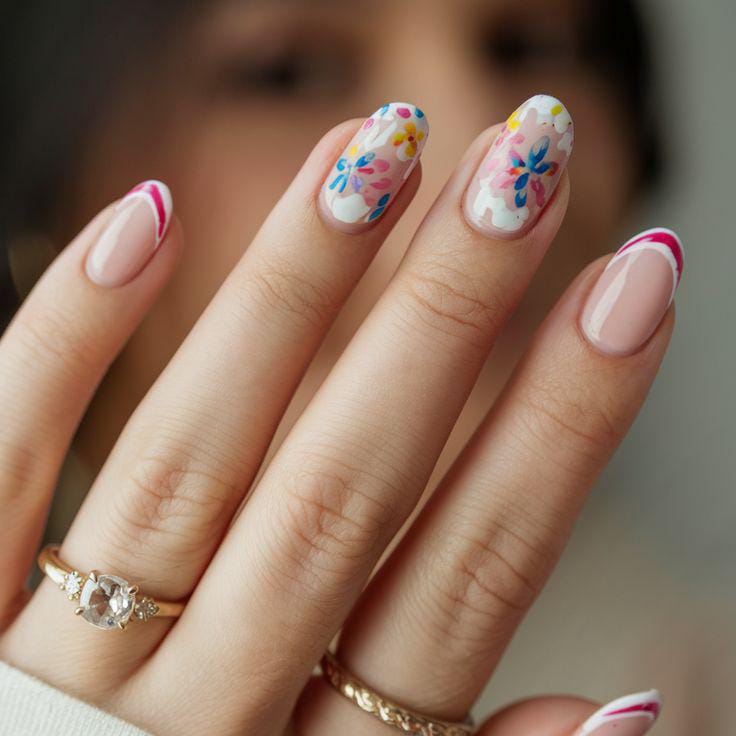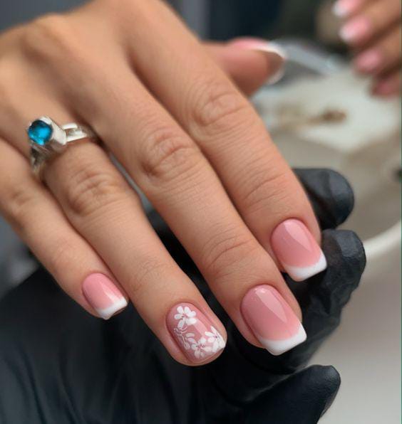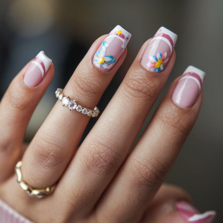 Light pink nails with clean French tips and playful pastel flowers look sweet and youthful in early spring. The overall style is fresh, soft, and subtly fun.
