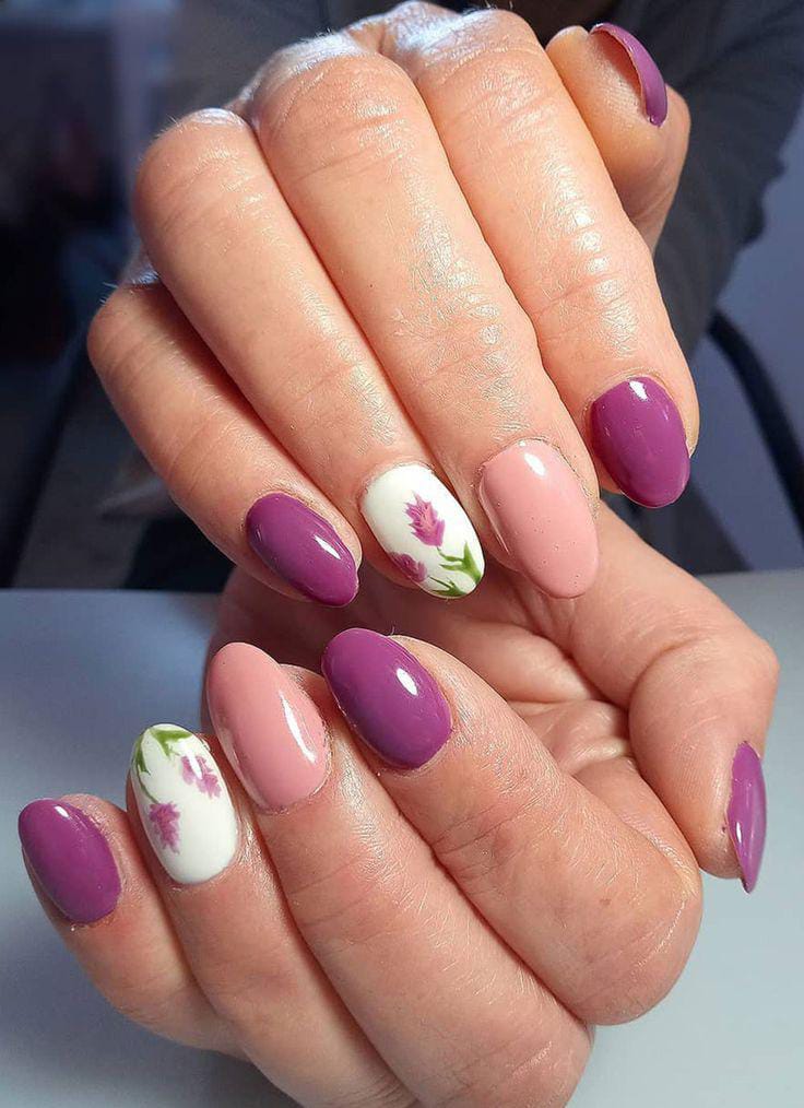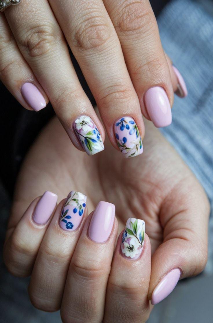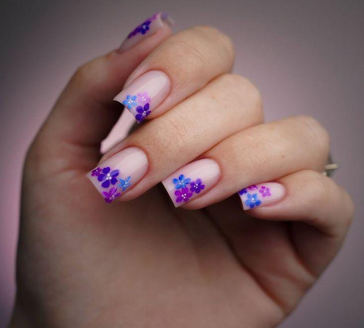 A pale pink base with purple and blue flowers gives this design a gentle early spring charm. The look is playful, fresh, and slightly romantic.