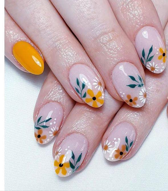 A nude base with yellow floral accents brings warmth and brightness to this design. It feels sunny, gentle, and full of early spring energy.