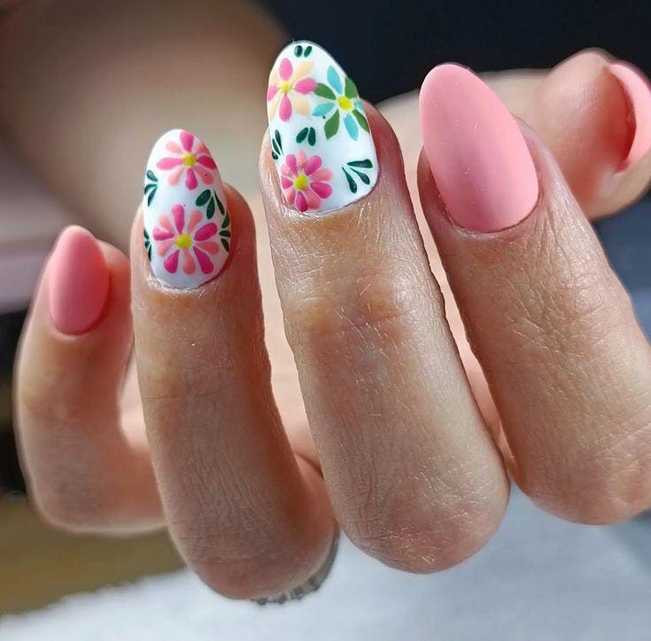 Soft pink nails are paired with delicate white accent nails featuring hand-painted floral patterns. The overall look feels fresh, feminine, and perfect for early spring.