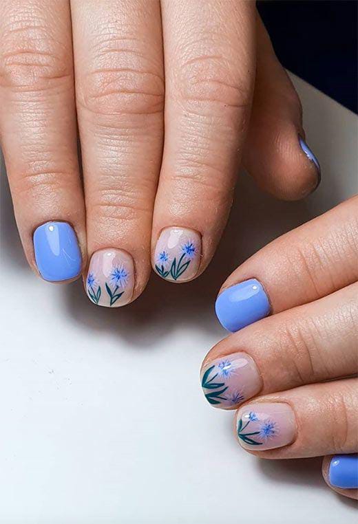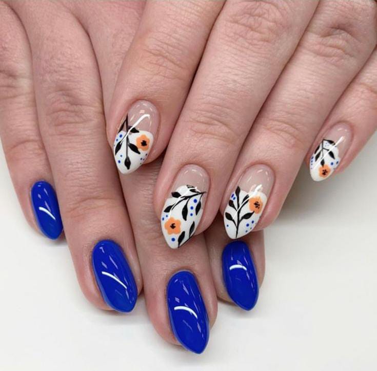 Bold cobalt blue nails are balanced with nude bases decorated in simple floral art. The mix of bright and neutral tones gives this design a modern early spring vibe.