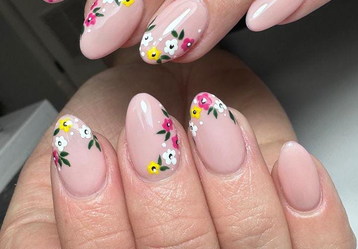 Light blush nails are enhanced with tiny colorful flowers scattered across a glossy finish. The design feels airy, playful, and gently romantic early spring.
