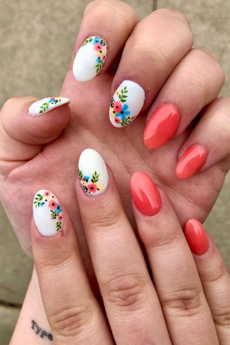 Warm coral nails are combined with white floral accents for a cheerful early spring look. The contrast adds energy while still keeping the design soft and seasonal.