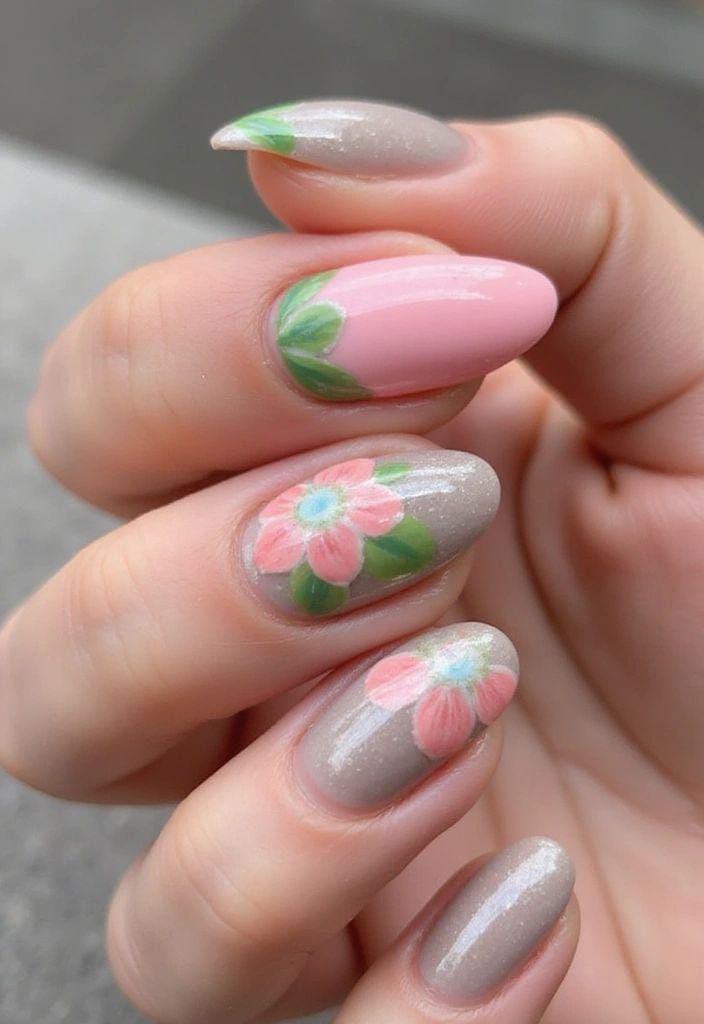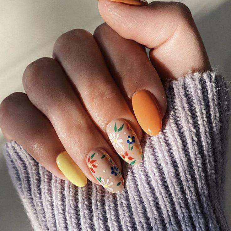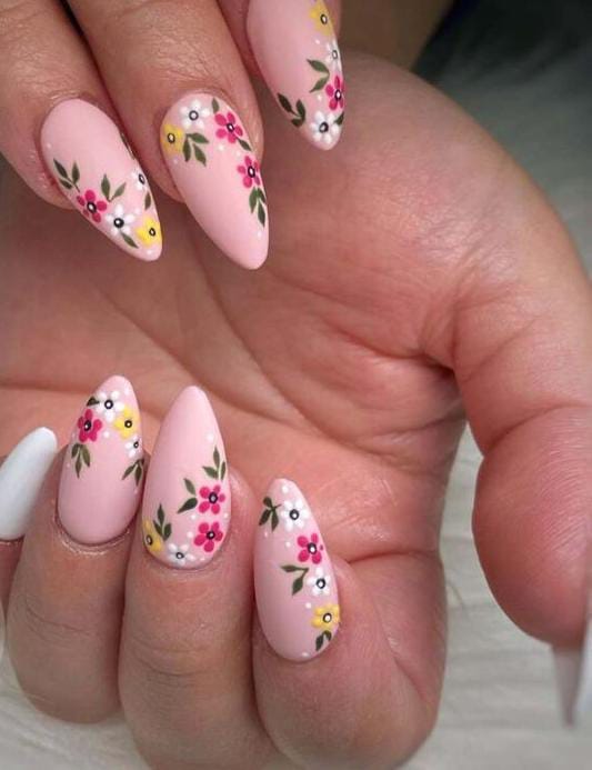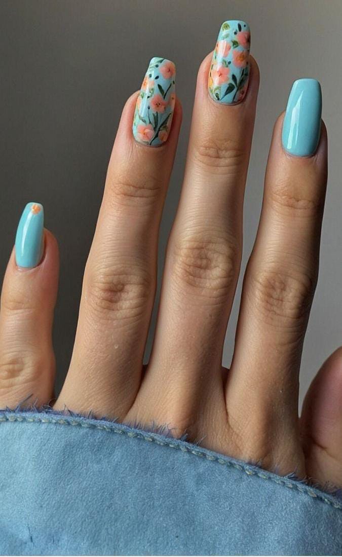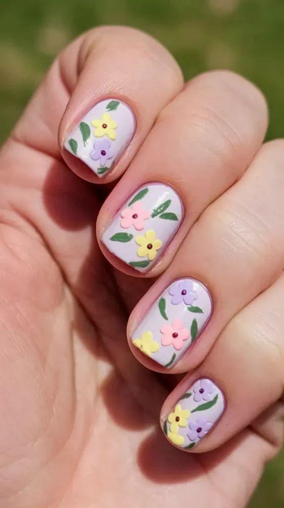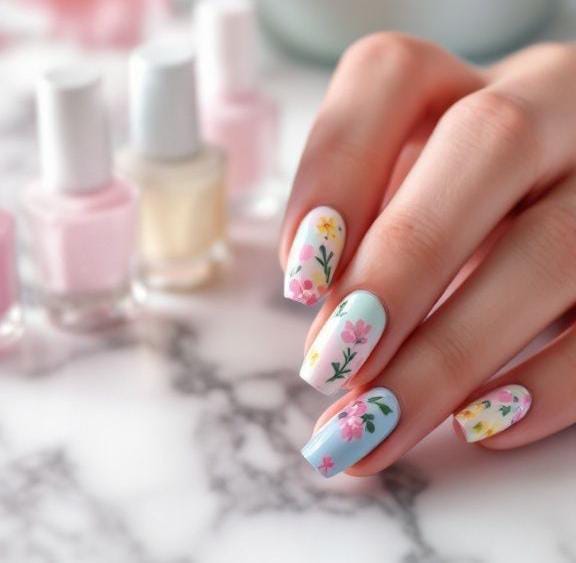 Pastel tones give these nails a bright and youthful appearance. Simple floral patterns keep the design soft and friendly. It feels fresh, fun, and ideal for early spring outings.