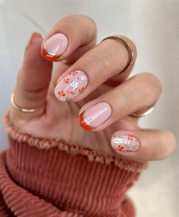 A soft nude-pink base paired with coral French tips and delicate floral details feels warm and cheerful. It has a cozy early-spring vibe with a modern twist.