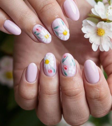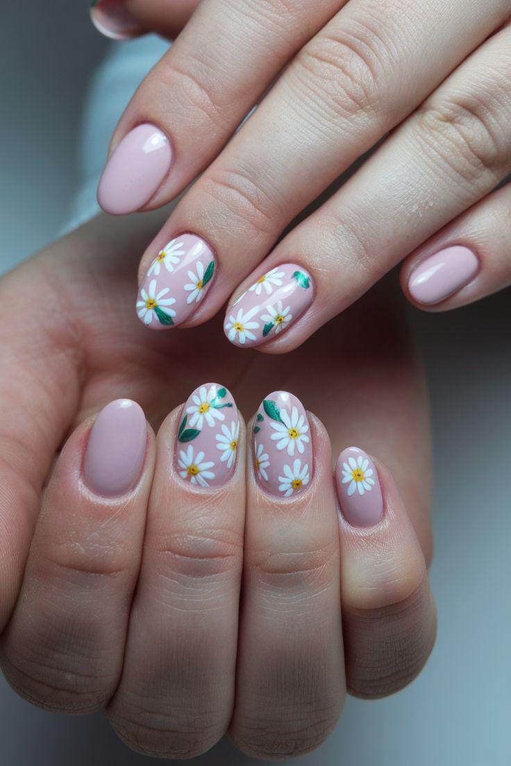 Soft pink nails paired with daisy accents create a bright and happy look. The floral design adds a natural early spring touch. Overall, the style feels fresh, feminine, and seasonal.