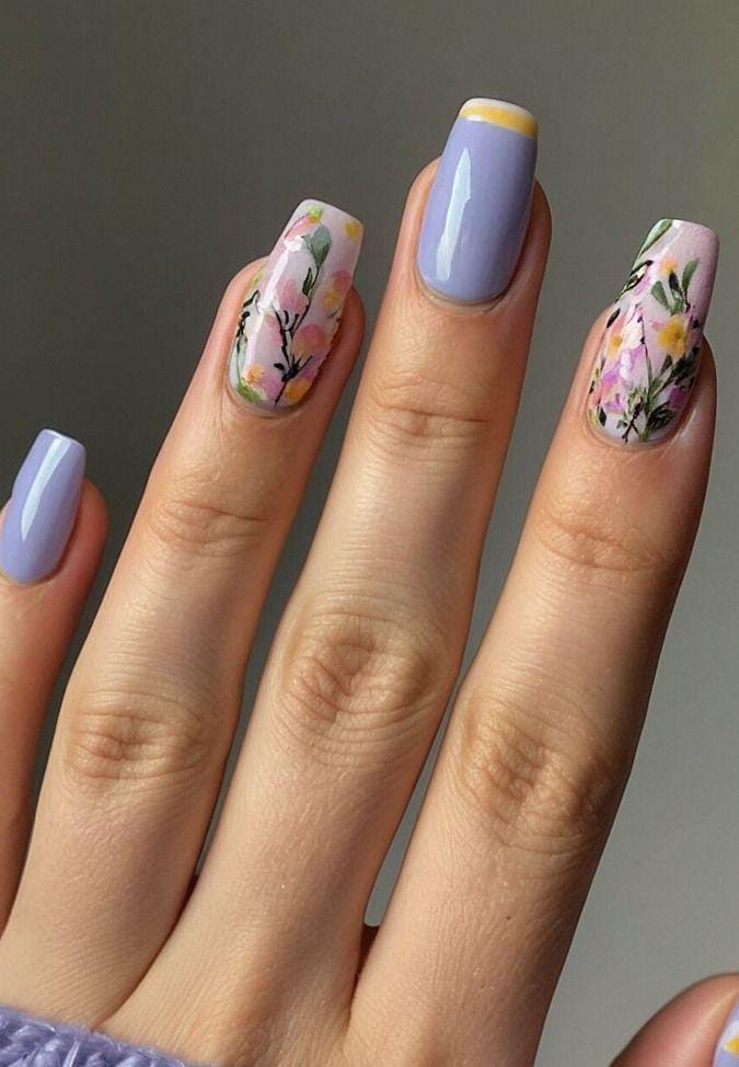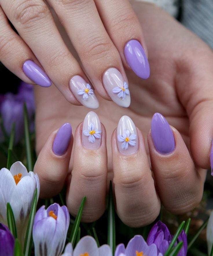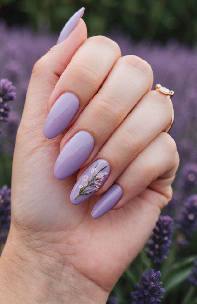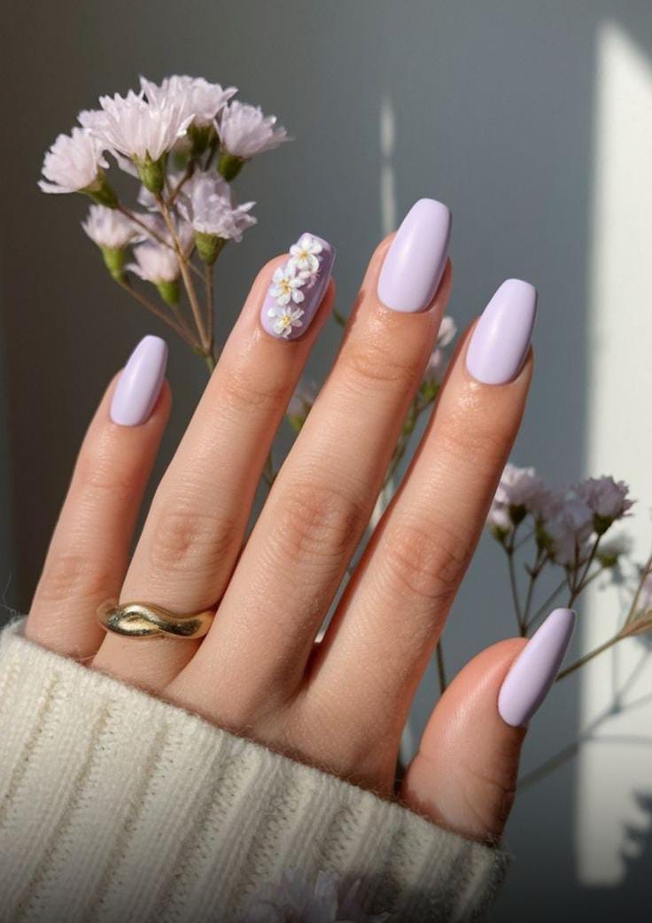 Soft lavender nails with delicate floral accents give a calm, fresh early spring feel. The design looks light, elegant, and very soothing.