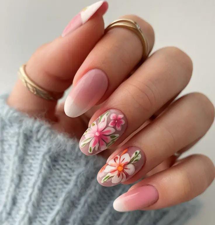 A gentle pink ombre blended with white floral patterns creates a romantic early spring look. The design feels light, graceful, and perfectly seasonal.